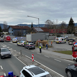 Am 09.01.2025 wurde die Feuerwehr Altach zu einem schweren Verkehrsunfall alarmiert. Ein LKW erfasste beim Rechtsabbiegen eine Fahrradfahrerin, die dabei unter die Reifen des Aufliegers geriet. Die Person war bei unserem Eintreffen nicht mehr eingeklemmt. Die Feuerwehr übernahm daraufhin den Aufbau eines Sichtschutzes und unterstützte das Rote Kreuz bei der Versorgung der Verletzten. Weiters wurden Absperrmaßnahmen für den Landeplatz des Rettungshubschraubers vorgenommen. Anschließend wurde durch uns die Straße gereinigt.
